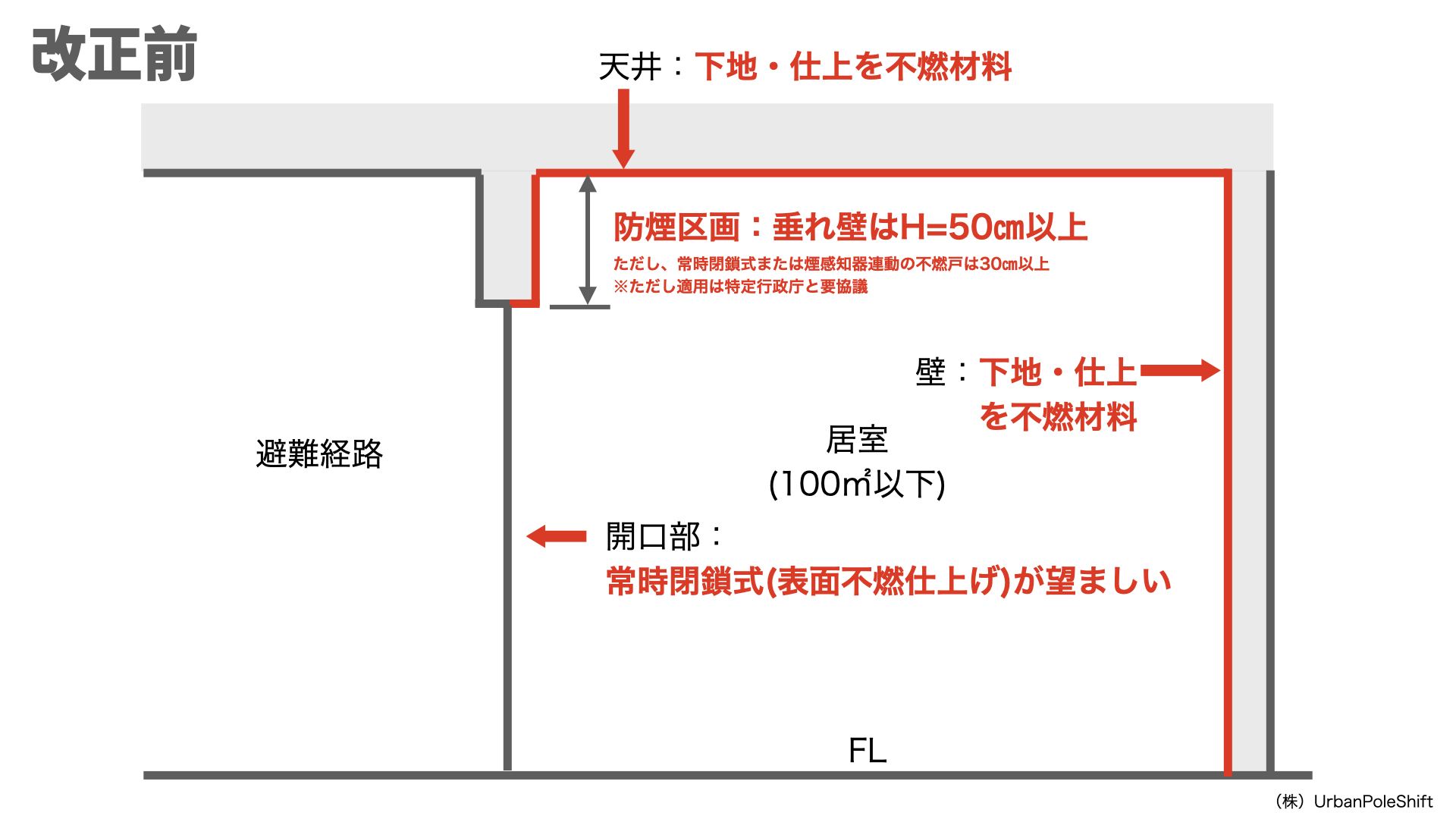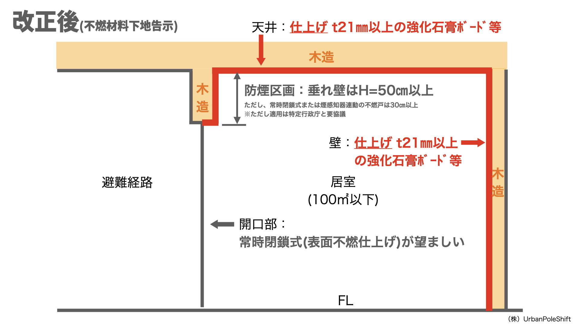 従来、居室排煙免除告示であるH12年告示第1436号第四号へ(5)の適用については、壁及び天井の室内に面する部分の仕上げを不燃材料でし、かつ、その下地を不燃材料で造ったものでなければならず、原則論からすると、下地が木造である建築物については、適用ができませんでした。